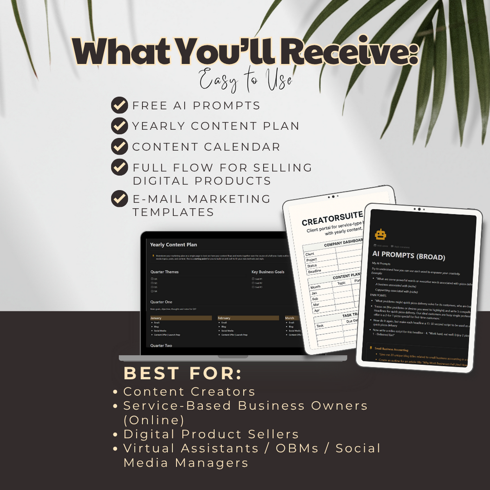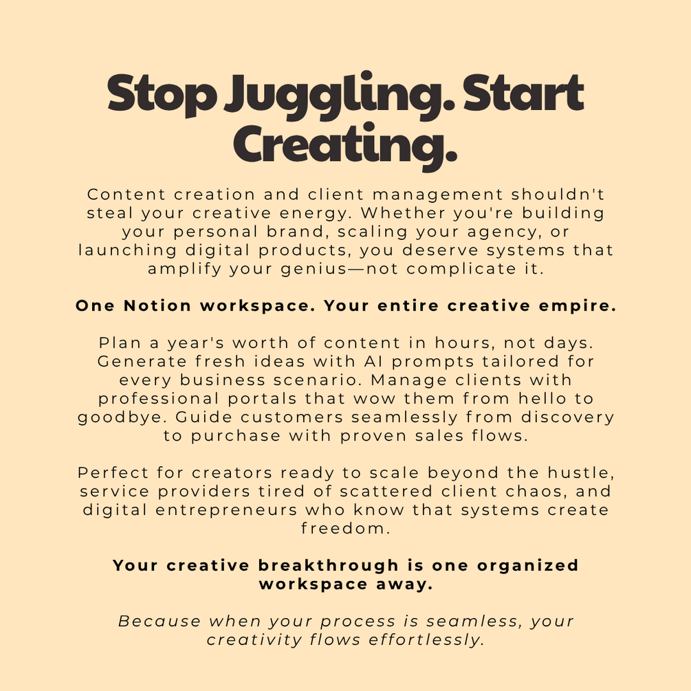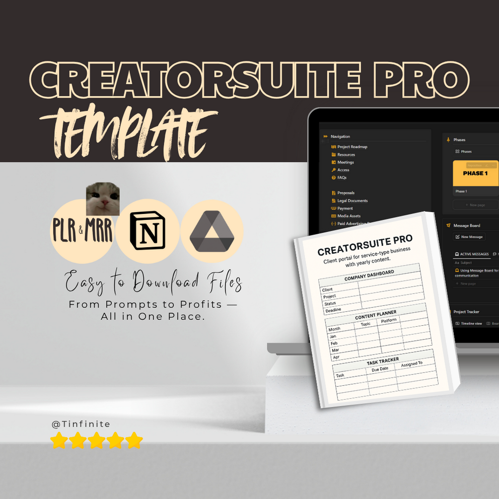 CREATORSUITE PRO is your AI-powered system for stress-free content creation, client management, and digital selling. Whether you're a creator, freelancer, coach, or entrepreneur, this suite gives you the structure and tools to stay organized, show up consistently, and grow with ease.